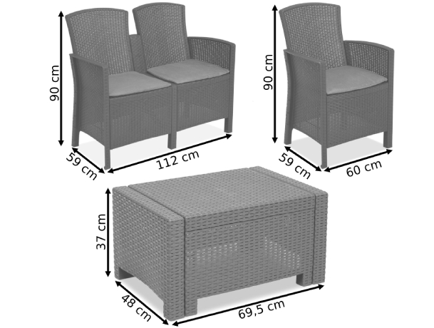 - До цього набору входять 2 крісла, невеликий диван і журнальний столик.